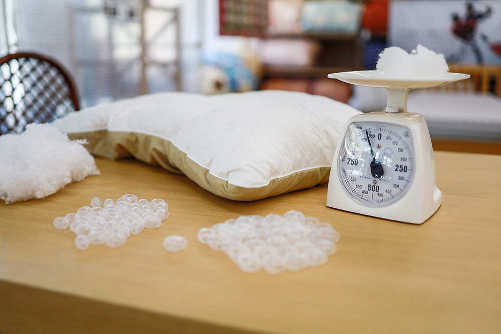 枕の具材へのこだわりみやざきは徹底的に枕の具材にこだわっています。 複数の具材をバランスよく使用してぴったりの寝心地の枕に仕上げます。